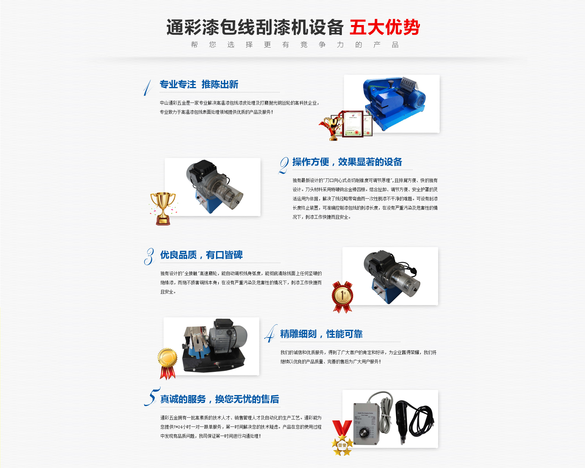 漆包线剥漆机_剥漆钢丝轮_剥漆纤维轮_剥漆刀具_中山通彩漆包线刮漆机公司2025-05-29中山通彩漆包线刮漆机公司公司拥有一支专业化、高度敬业的实践技师队伍,完善的管理体系和先进的制造设备,严格按照客户的需求进行生产控制,使公司产品质量得到保障。中山通彩漆包线刮漆机公司连续多年保持行业领先水平。销售公司和终端客户反映产品质量稳定、性能优良、服务上乘。公司立志为广大企业提供高质量的优质产品,“客户信赖及首选的品牌供货商”是“通彩人”的永恒追求。我们也时刻以此来严格要求自己。研发及销售出实用产品,期待在最关键的时候为您提供最全面的方案以及最完善的产品及服务。 -